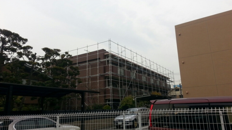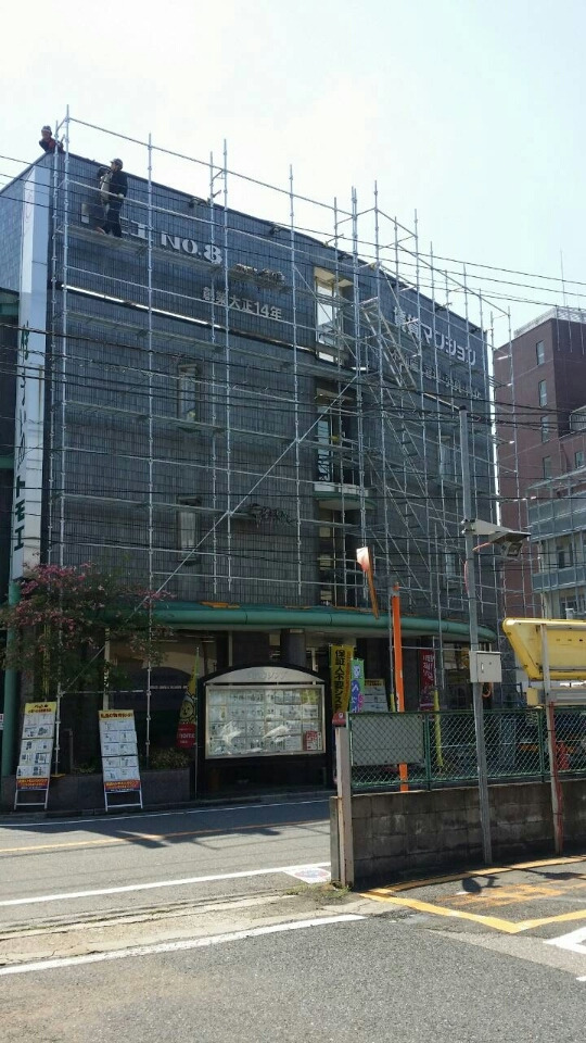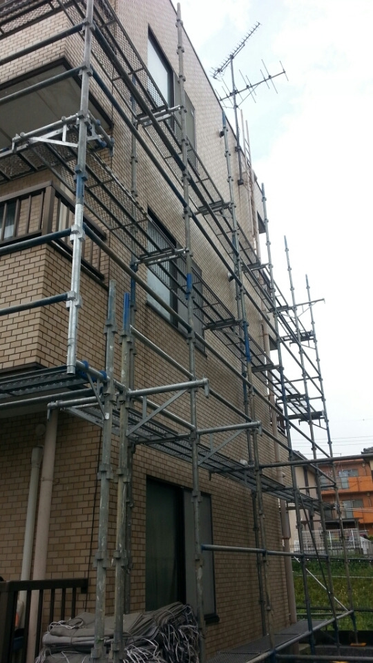 よく見るとこの建物、真ん中で角度が変わっているので、クランプを使って斜めに足場を組んでいます(^_^.)