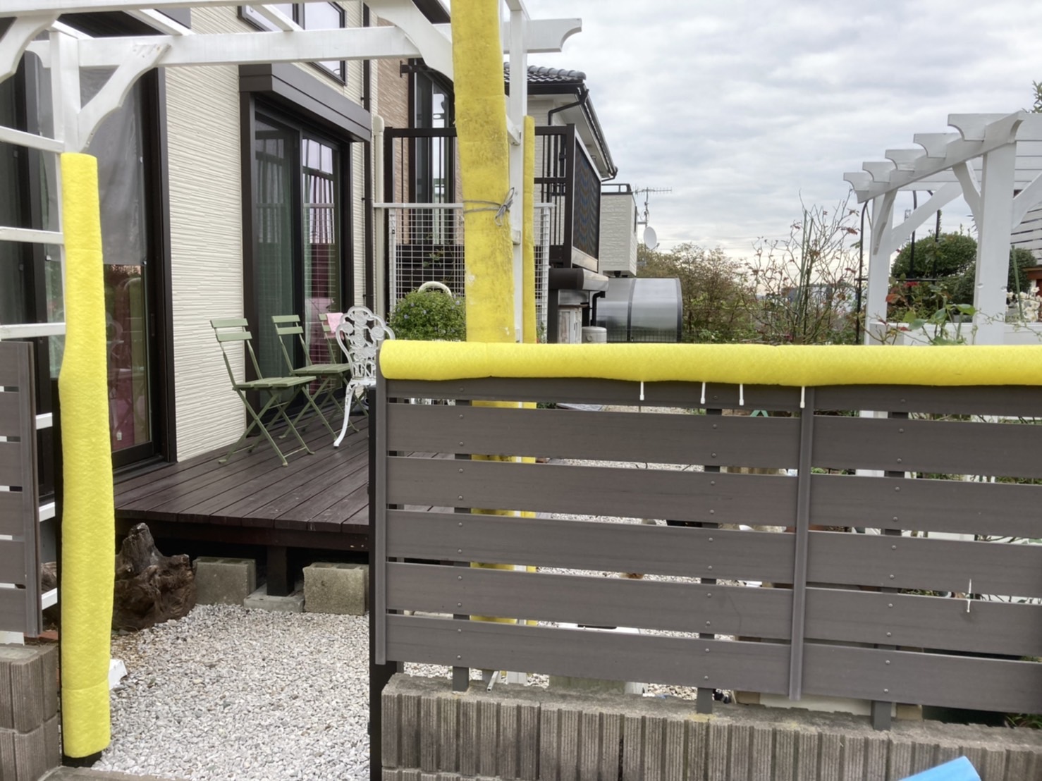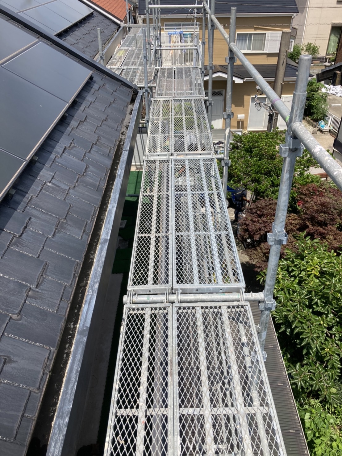 屋根上にソーラーパネルがあり、塗装の際に一度取り外すので軒先に広めの通路を設置しました。