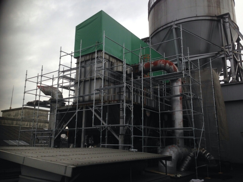 煙突は防音シート、仮囲いは防炎シートで施工しています。