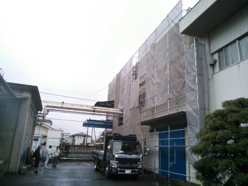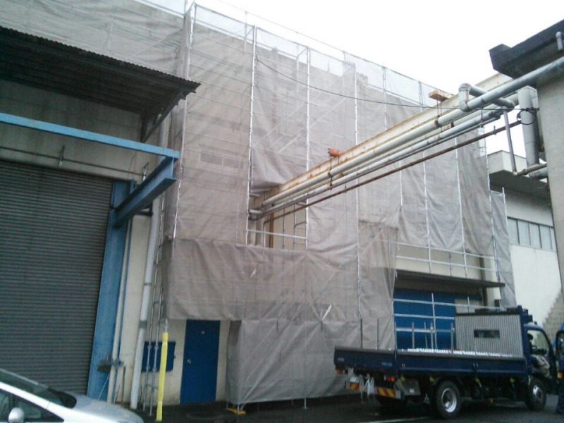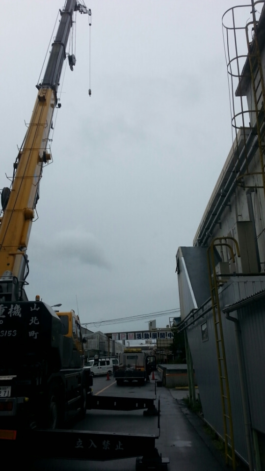 工場の屋上にある鉄骨を塗装する為の足場なんですが、人力ではとても材料上げられないので、元請け様の方でラフタークレーンを用意して頂きました!