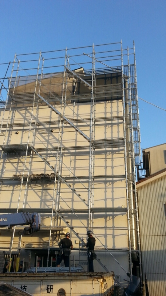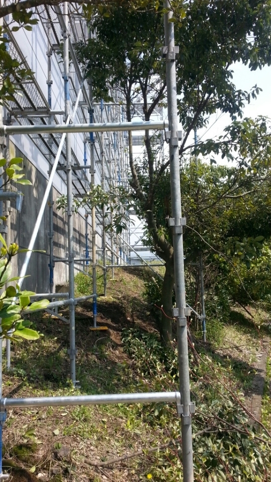 配管や庇、鉄骨階段など障害物が多いのですが、うまく避けて組んであります(‘∀`)