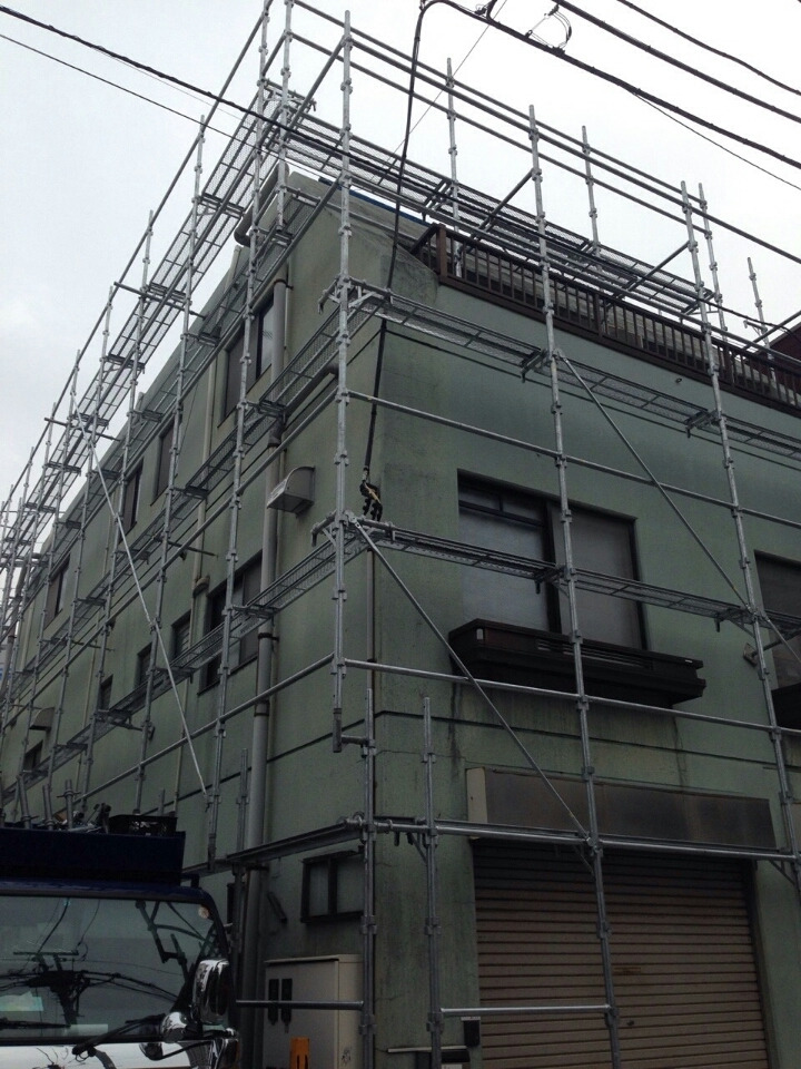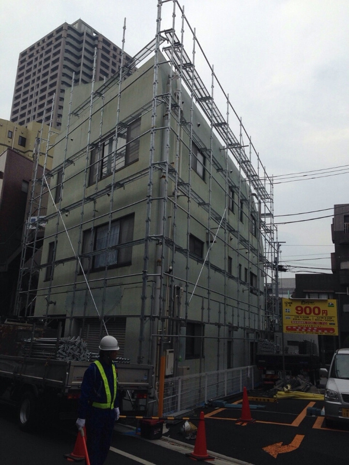 東京都内の5階建ての仮設足場工事の現場です。