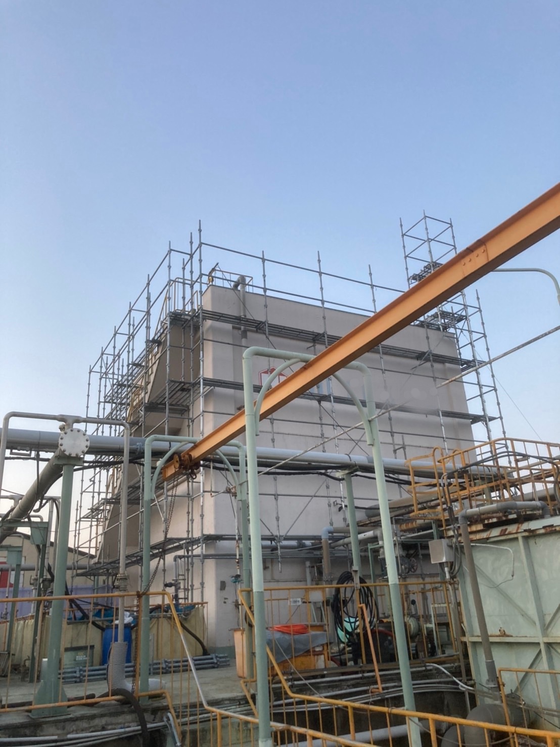 建物に配管がたくさんついていてほとんど現場合わせで組んでいきます。